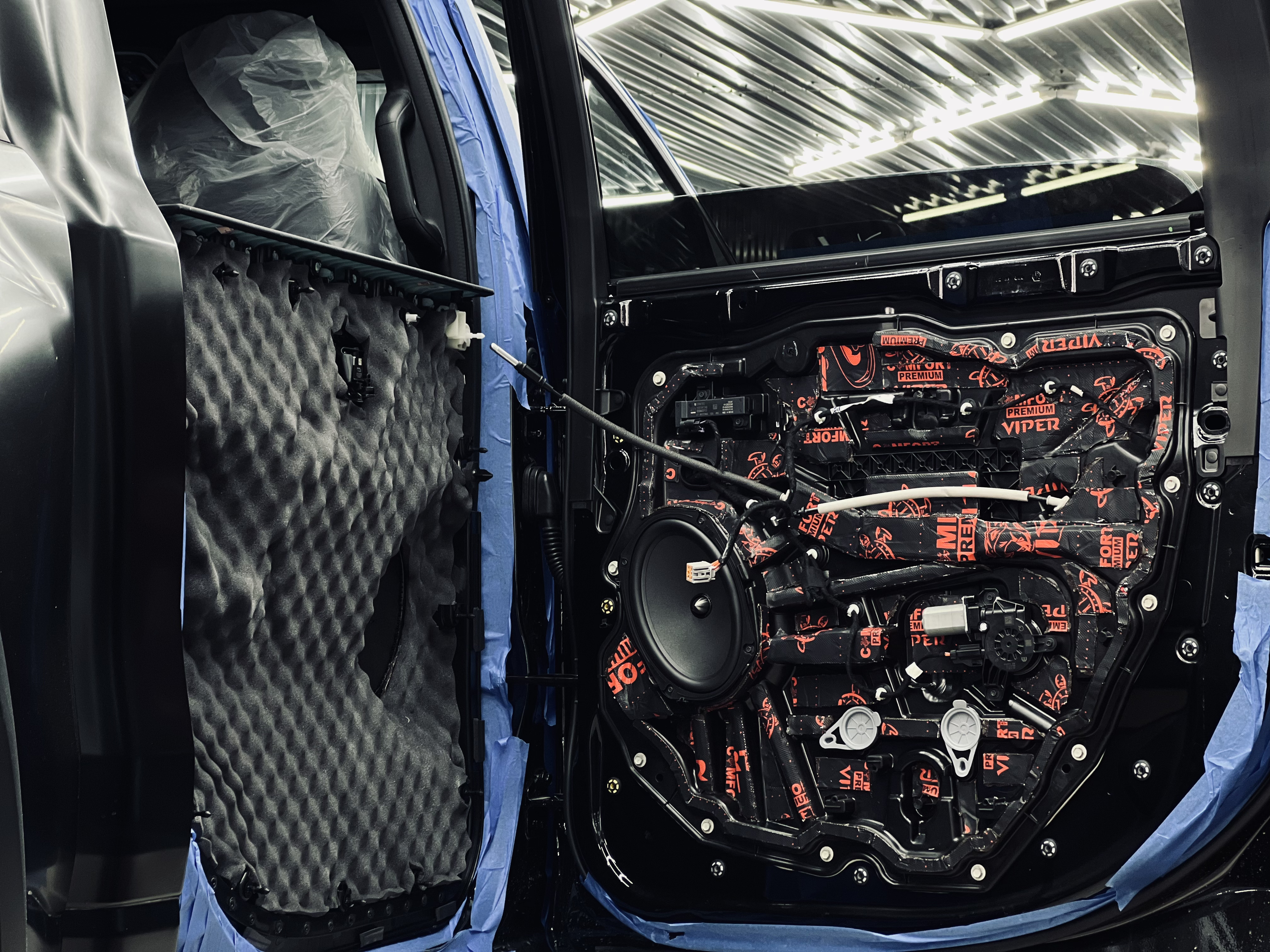Двери – важный элемент шумоизоляции, через который проникают звуки улицы, ветра и двигателя. Мы обработали их в несколько слоев, чтобы обеспечить тишину и улучшить звучание акустики.