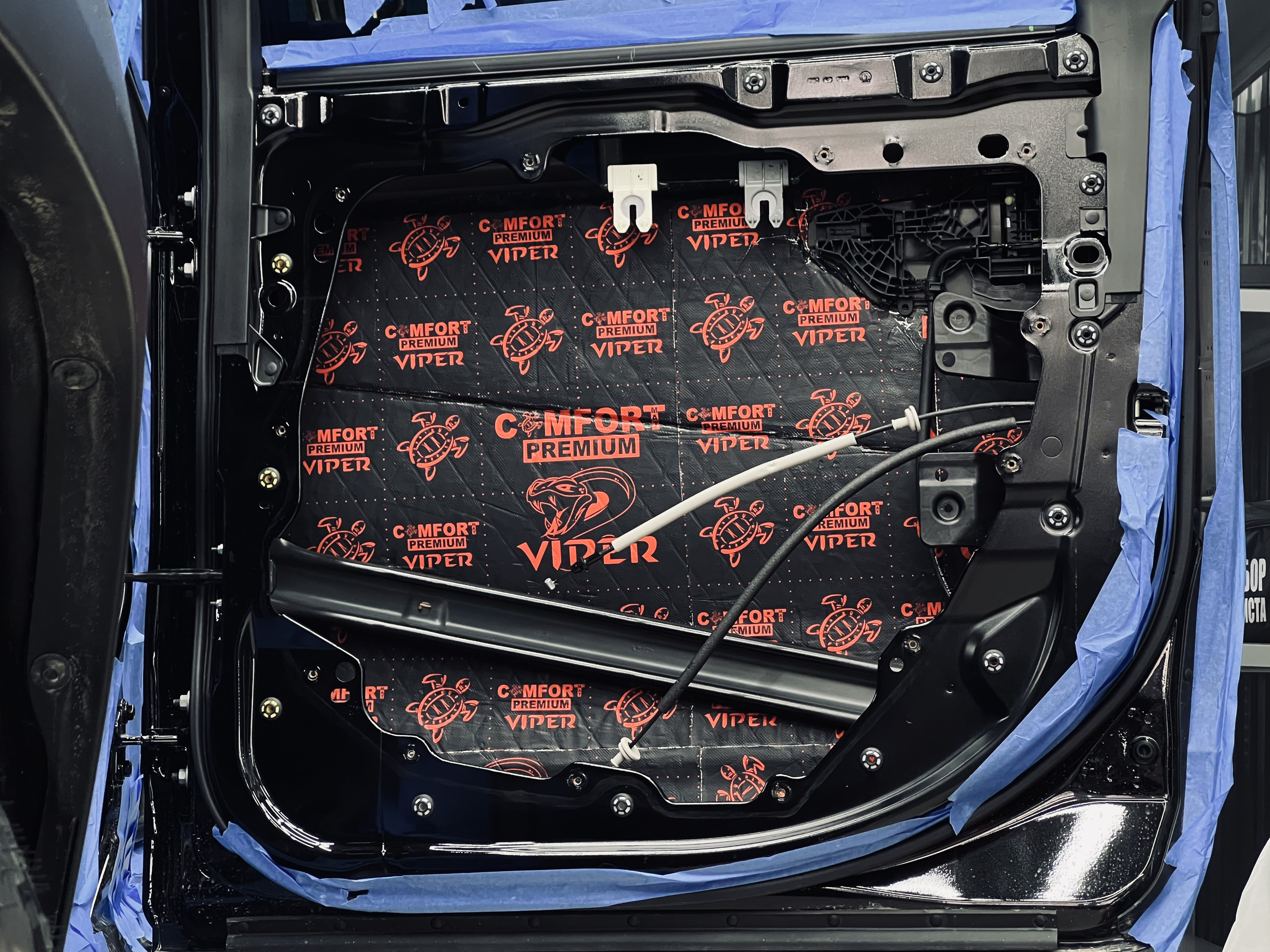 Первым слоем нанесли виброизоляцию Comfort Mat Viper, которая гасит вибрации и создает прочную основу. На снимке виден процесс наклейки Viper на внутреннюю стенку двери, с аккуратным нанесением.
