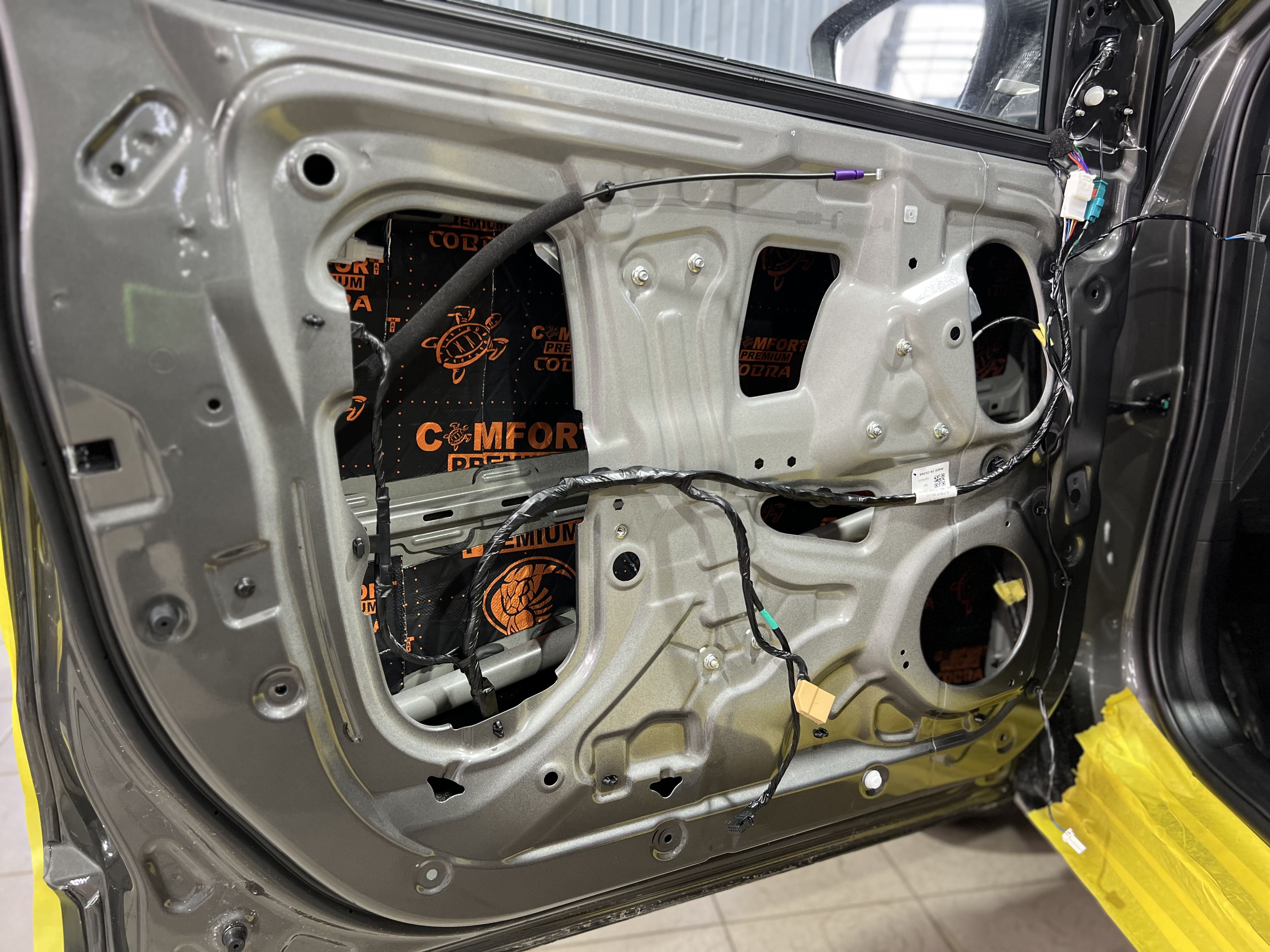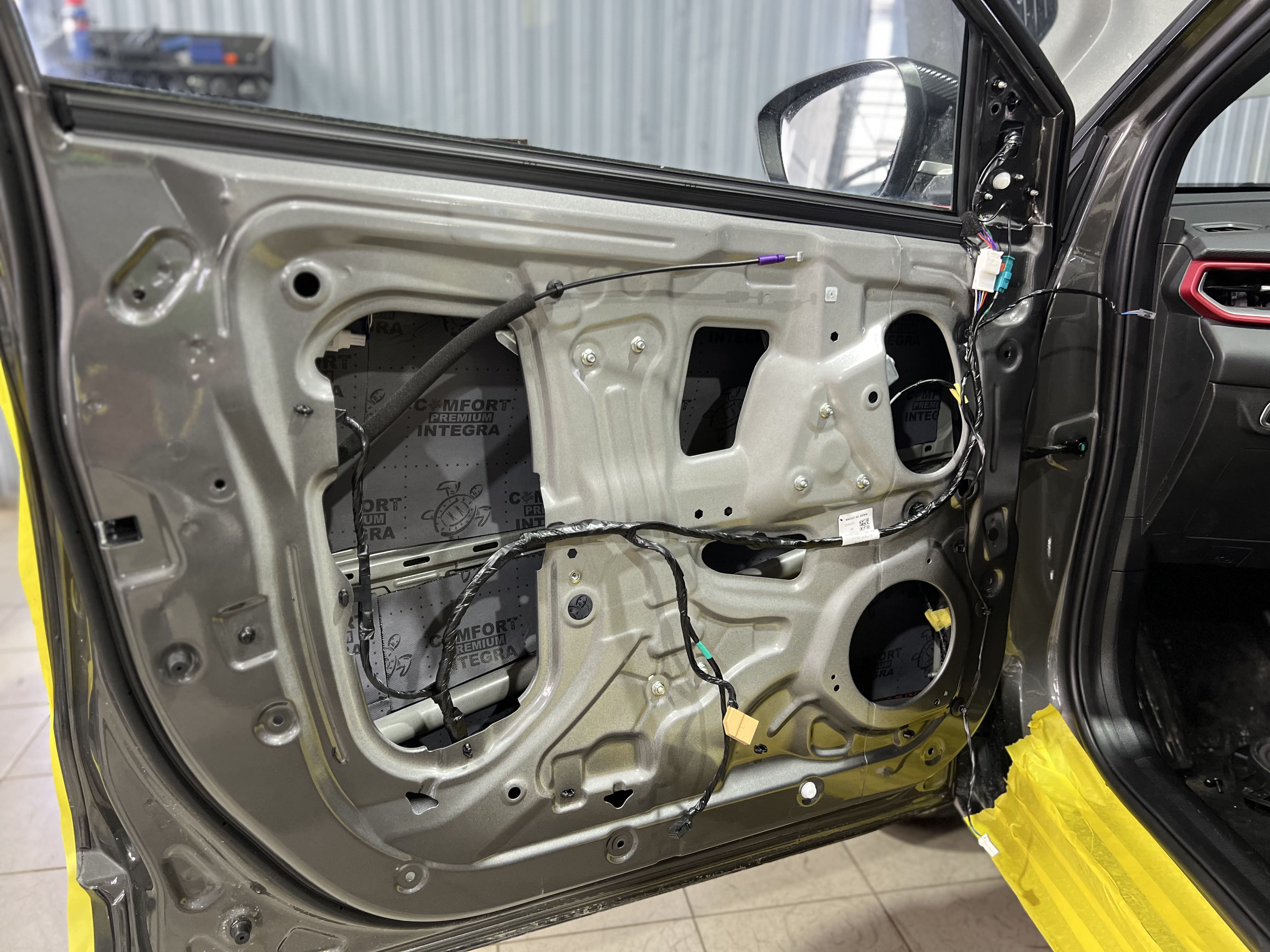 Вторым слоем на двери уложили шумоизоляцию Comfort Mat Integra, поглощающую внешние шумы и добавляющую теплоизоляцию.