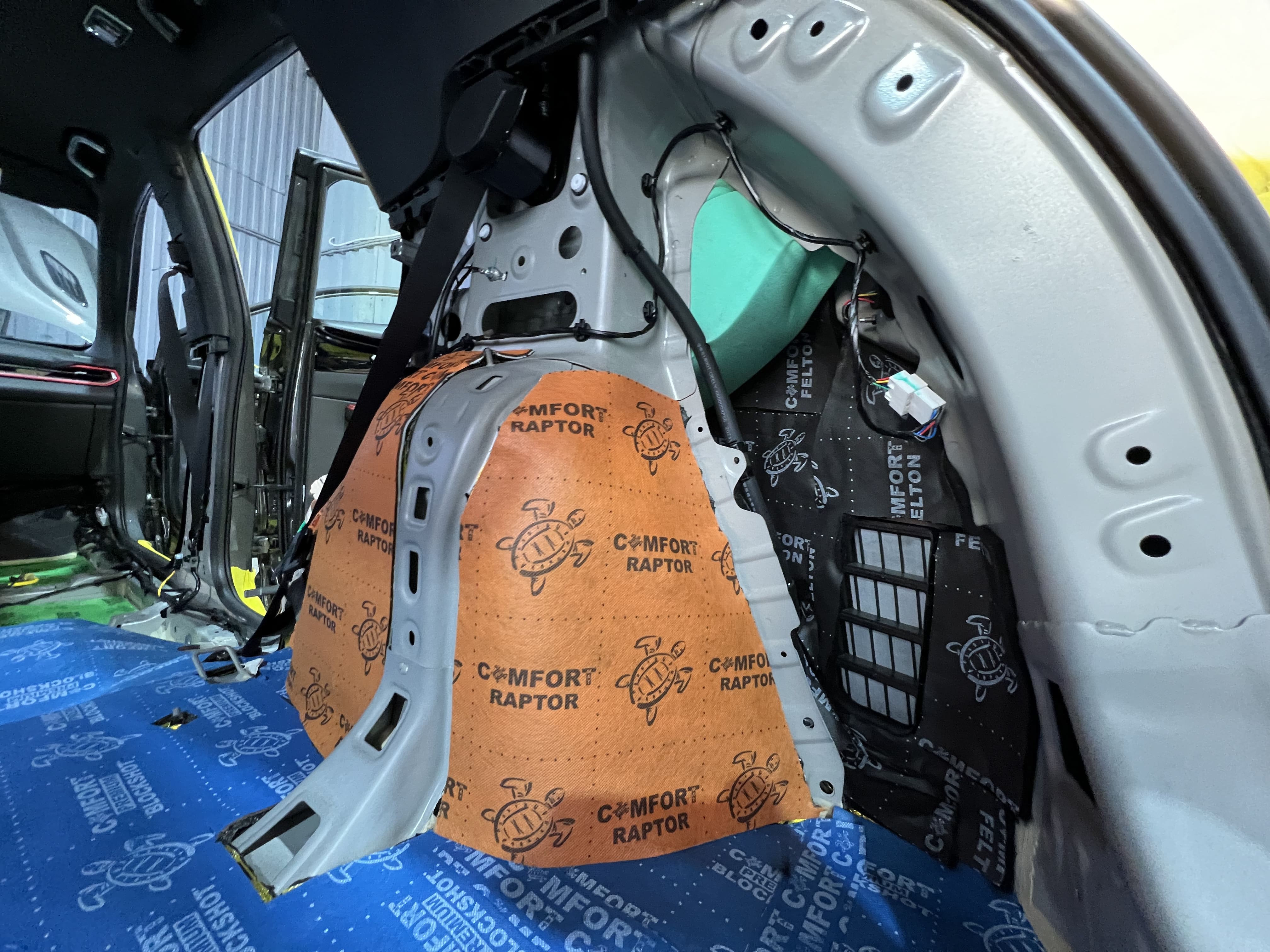 Процесс нанесения второго слоя требовал высокой точности и профессионализма. Вторым слоем в районе передних пассажирских сидений уложили Comfort Mat Titan, на дно салона и багажника – Comfort Mat Blockshot, а на выступающие части над колесными арками и в районе центральной консоли – Comfort Mat Raptor. На стенки багажника нанесли Comfort Mat Felton и Comfort Mat Soundtrap Green. Для закрытия швов и стыков мы использовали контурную ленту, подобранную в тон шумоизоляции, что не только повышает надежность, но и придает эстетичный вид, даже скрытый под ковровым покрытием.