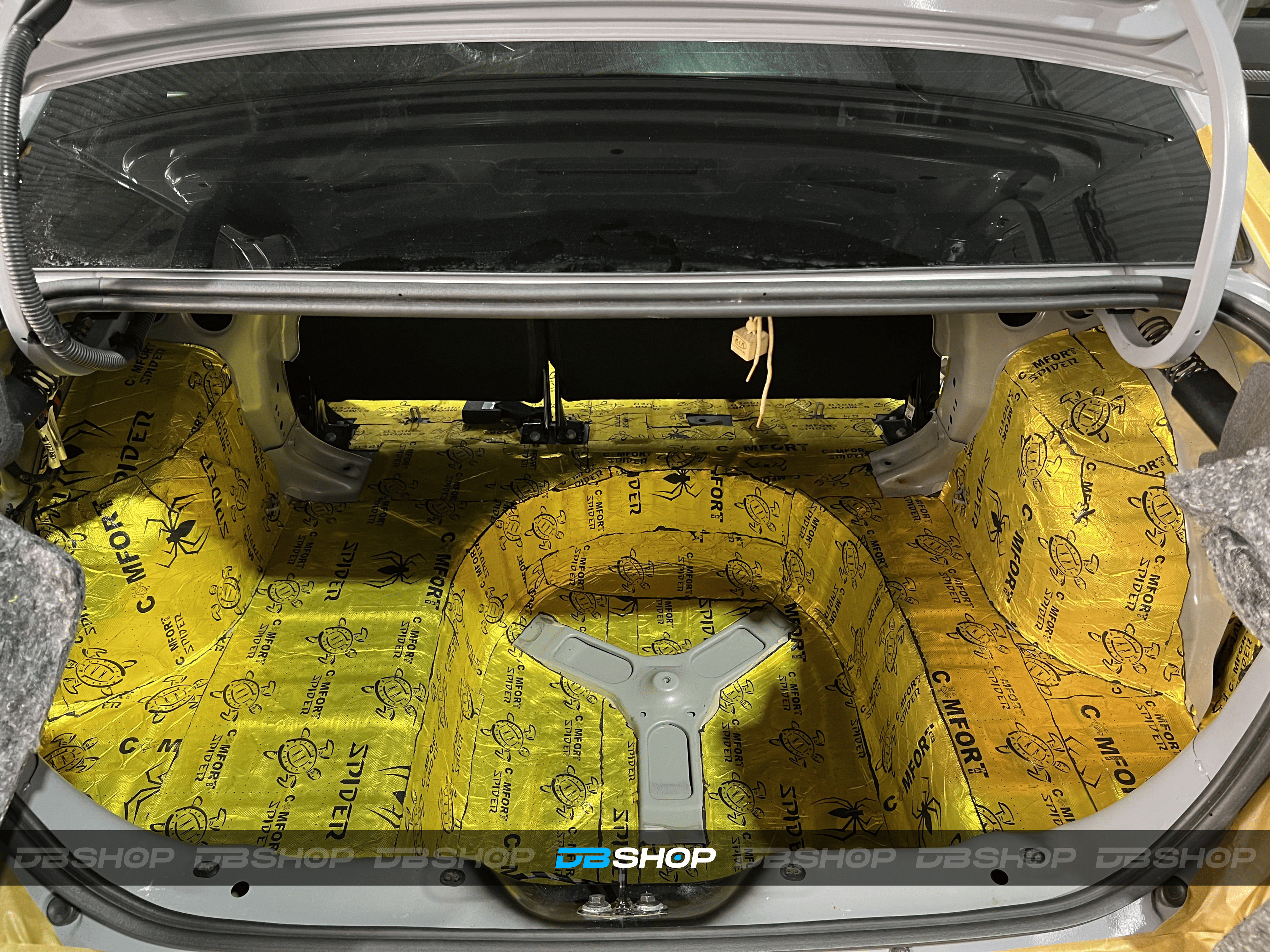 Первым слоем на дно салона и багажник нанесли виброизоляцию Comfort Mat Spider. На снимке виден готовый слой Spider, плотно наклеенный на поверхности, обеспечивающий прочную основу.
