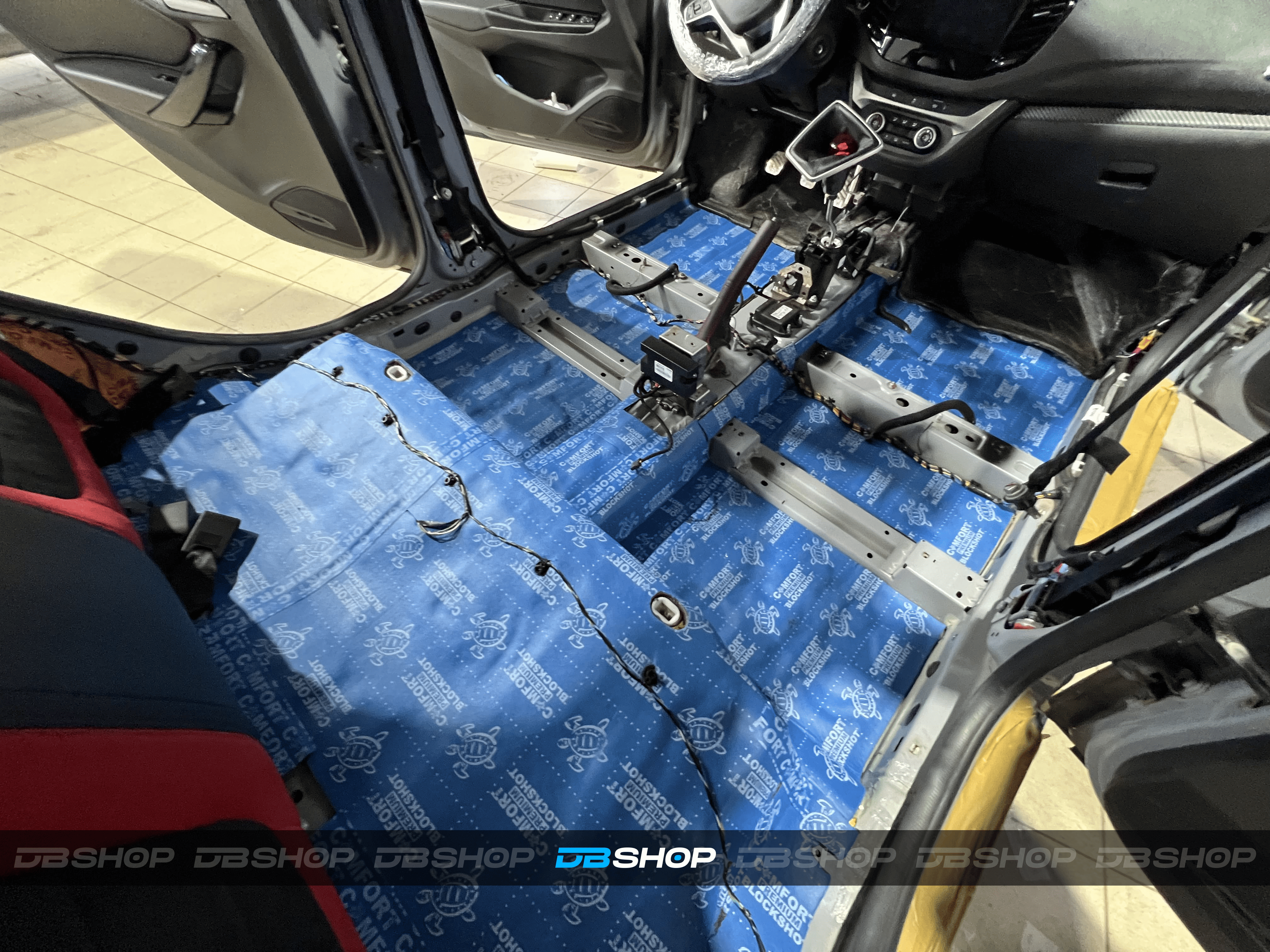 Вторым слоем на дно салона и багажник уложили Comfort Mat Premium Blockshot, а на выступающие части над колесными арками – Comfort Mat Raptor. Для герметизации швов и стыков мы применили контурную ленту, подобранную в тон изоляции, что повышает надежность и придает аккуратный вид, даже скрытый под ковровым покрытием.